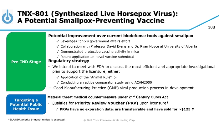 © 2019 Tonix Pharmaceuticals Holding Corp. 108 TNX - 801 (Synthesized Live Horsepox Virus): A Potential Smallpox - Preventing Vaccine Pre - IND Stage Potential improvement over current biodefense tools against smallpox ✓ Leverages Tonix’s government affairs effort ✓ Collaboration with Professor David Evans and Dr. Ryan Noyce at University of Alberta ✓ Demonstrated protective vaccine activity in mice ✓ Patent application on novel vaccine submitted Regulatory strategy • We intend to meet with FDA to discuss the most efficient and appropriate investigational plan to support the licensure, either: ✓ Application of the “Animal Rule”, or ✓ Conducting an active comparator study using ACAM2000 • Good Manufacturing Practice (GMP) viral production process in development Targeting a Potential Public Health Issue Material threat medical countermeasure under 21 st Century Cures Act • Qualifies for Priority Review Voucher (PRV) upon licensure * ✓ PRVs have no expiration date, are transferrable and have sold for ~$125 M *BLA/NDA priority 6 - month review is expected.