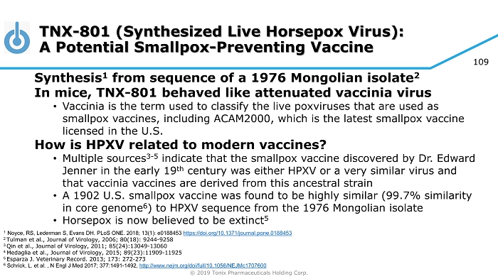 © 2019 Tonix Pharmaceuticals Holding Corp. 109 TNX - 801 (Synthesized Live Horsepox Virus): A Potential Smallpox - Preventing Vaccine Synthesis 1 from sequence of a 1976 Mongolian isolate 2 In mice, TNX - 801 behaved like attenuated vaccinia virus • Vaccinia is the term used to classify the live poxviruses that are used as smallpox vaccines, including ACAM2000, which is the latest smallpox vaccine licensed in the U.S. How is HPXV related to modern vaccines? • Multiple sources 3 - 5 indicate that the smallpox vaccine discovered by Dr. Edward Jenner in the early 19 th century was either HPXV or a very similar virus and that vaccinia vaccines are derived from this ancestral strain • A 1902 U.S. smallpox vaccine was found to be highly similar (99.7% similarity in core genome 6 ) to HPXV sequence from the 1976 Mongolian isolate • Horsepox is now believed to be extinct 5 1 Noyce, RS, Lederman S, Evans DH. PLoS ONE. 2018; 13(1): e0188453 https://doi.org/10.1371/journal.pone.0188453 2 Tulman et al., Journal of Virology, 2006; 80(18): 9244 - 9258 3 Qin et al., Journal of Virology, 2011; 85(24):13049 - 13060 4 Medaglia et al., Journal of Virology, 2015; 89(23):11909 - 11925 5 Esparza J. Veterinary Record. 2013; 173: 272 - 273 6 Schrick , L. et al. , N Engl J Med 2017; 377:1491 - 1492, http://www.nejm.org/doi/full/10.1056/NEJMc1707600