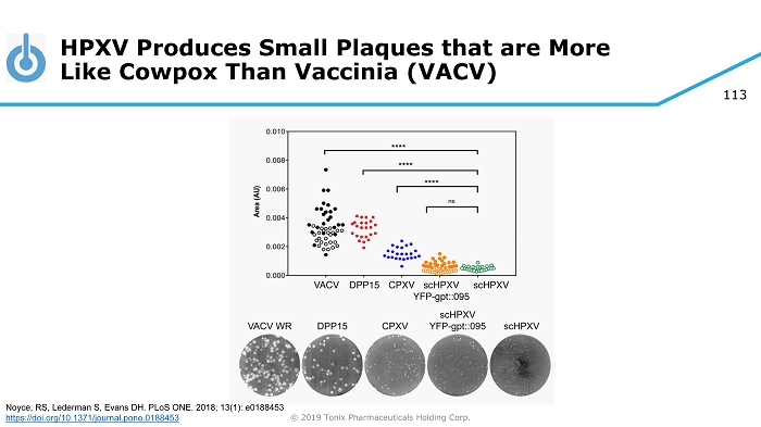 113 © 2019 Tonix Pharmaceuticals Holding Corp. HPXV Produces Small Plaques that are More Like Cowpox Than Vaccinia (VACV) Noyce, RS, Lederman S, Evans DH. PLoS ONE. 2018; 13(1): e0188453 https://doi.org/10.1371/journal.pone.0188453