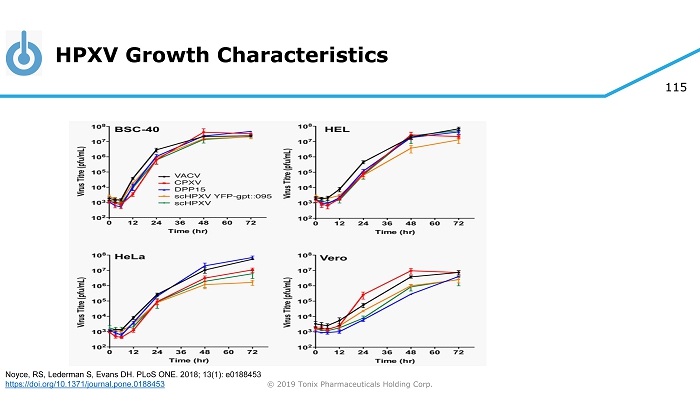 115 © 2019 Tonix Pharmaceuticals Holding Corp. HPXV Growth Characteristics Noyce, RS, Lederman S, Evans DH. PLoS ONE. 2018; 13(1): e0188453 https://doi.org/10.1371/journal.pone.0188453