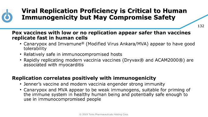 © 2019 Tonix Pharmaceuticals Holding Corp. 132 Pox vaccines with low or no replication appear safer than vaccines replicate fast in human cells • Canarypox and Imvamune ® (Modified Virus Ankara/MVA) appear to have good tolerability • Relatively safe in immunocompromised hosts • Rapidly replicating modern vaccinia vaccines ( Dryvax ® and ACAM2000®) are associated with myocarditis Replication correlates positively with immunogenicity • Jenner’s vaccine and modern vaccinia engender strong immunity • Canarypox and MVA appear to be weak immunogens, suitable for priming of the immune system in healthy human being and potentially safe enough to use in immunocompromised people Viral Replication Proficiency is Critical to Human Immunogenicity but May Compromise Safety