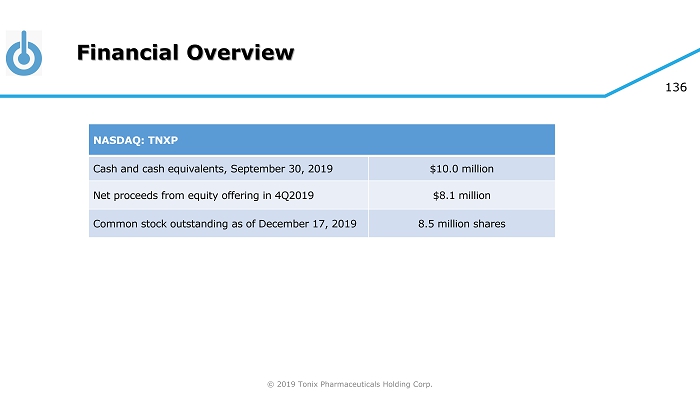 © 2019 Tonix Pharmaceuticals Holding Corp. 136 Financial Overview NASDAQ: TNXP Cash and cash equivalents, September 30, 2019 $10.0 million Net proceeds from equity offering in 4Q2019 $8.1 million Common stock outstanding as of December 17, 2019 8.5 million shares
