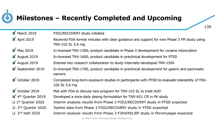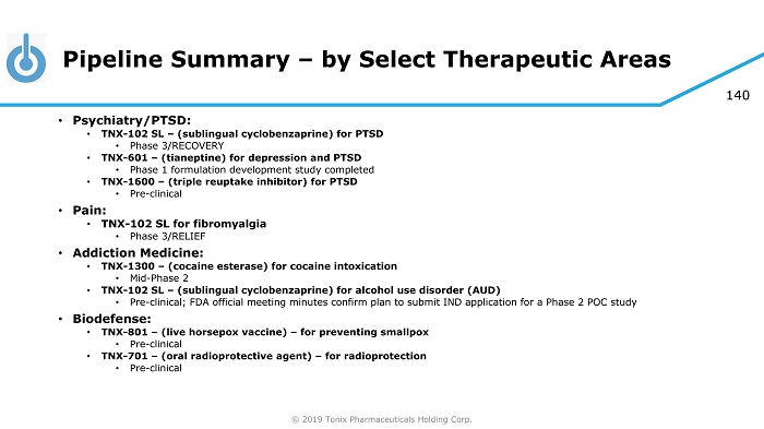© 2019 Tonix Pharmaceuticals Holding Corp. 139 Milestones – Recently Completed and Upcoming □ March 2019 P302/RECOVERY study initiated □ April 2019 Received FDA formal minutes with clear guidance and support for new Phase 3 FM study using TNX - 102 SL 5.6 mg □ May 2019 In - licensed TNX - 1300, product candidate in Phase 2 development for cocaine intoxication □ August 2019 In - licensed TNX - 1600, product candidate in preclinical development for PTSD □ August 2019 Entered into research collaboration to study internally - developed TNX - 1500 □ September 2019 In - licensed TNX - 1700, product candidate in preclinical development for gastric and pancreatic cancers □ October 2019 Completed long - term exposure studies in participants with PTSD to evaluate tolerability of TNX - 102 SL 5.6 mg □ October 2019 Met with FDA to discuss new program for TNX - 102 SL to treat AUD □ 4 th Quarter 2019 Developed a once - daily dosing formulation for TNX - 601 CR in PK study □ 1 st Quarter 2020 Interim analysis results from Phase 3 P302/RECOVERY study in PTSD expected □ 2 nd Quarter 2020 Topline data from Phase 3 P302/RECOVERY study in PTSD expected □ 2 nd Half 2020 Interim analysis results from Phase 3 F304/RELIEF study in fibromyalgia expected x x x x x x x x x