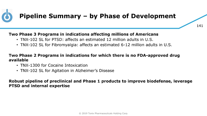 © 2019 Tonix Pharmaceuticals Holding Corp. 140 Pipeline Summary – by Select Therapeutic Areas • Psychiatry/PTSD: • TNX - 102 SL – (sublingual cyclobenzaprine) for PTSD • Phase 3/RECOVERY • TNX - 601 – (tianeptine) for depression and PTSD • Phase 1 formulation development study completed • TNX - 1600 – (triple reuptake inhibitor) for PTSD • Pre - clinical • Pain: • TNX - 102 SL for fibromyalgia • Phase 3/RELIEF • Addiction Medicine: • TNX - 1300 – (cocaine esterase) for cocaine intoxication • Mid - Phase 2 • TNX - 102 SL – (sublingual cyclobenzaprine) for alcohol use disorder (AUD) • Pre - clinical; FDA official meeting minutes confirm plan to submit IND application for a Phase 2 POC study • Biodefense: • TNX - 801 – (live horsepox vaccine) – for preventing smallpox • Pre - clinical • TNX - 701 – (oral radioprotective agent) – for radioprotection • Pre - clinical