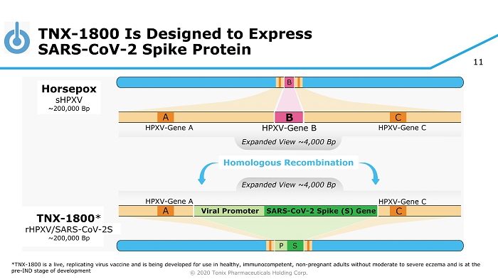 © 2020 Tonix Pharmaceuticals Holding Corp. 10 Potential for Use of Horsepox as a Vector Platform for other Infectious Diseases Horsepox can be engineered to express foreign genes and serve as a platform for vaccine development • Large packaging capacity for exogenous DNA inserts (i.e. encoding antigens) • Precise virus - specific control of exogenous gene insert expression • Lack of persistence or genomic integration in the host • Strong immunogenicity as a vaccine • Ability to rapidly generate vector/insert constructs • Readily manufacture at scale • Live, replicating vaccine – direct antigen presentation Potential advantages of horsepox over vaccinia • Maintains strong immunogenicity with potentially improved tolerability • Relative to non - replicating vaccinia, horsepox’s replication in human cells provides direct antigen presentation by Class I MHC • Horsepox may behave differently as a vector, in part because of its different repertoire of genes that modulate immune responses and host range