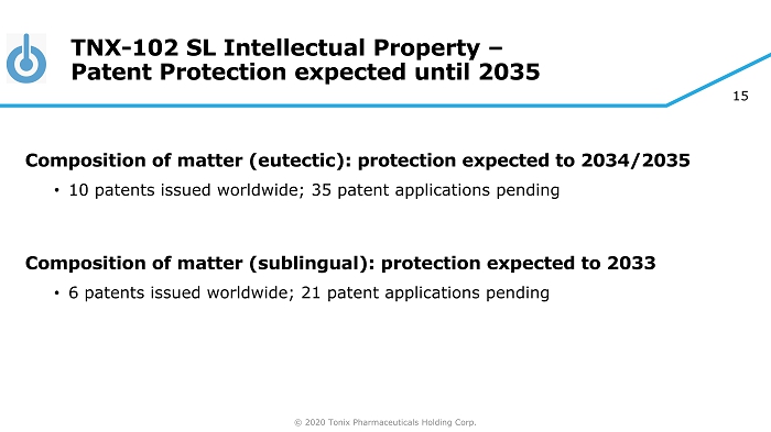 © 2020 Tonix Pharmaceuticals Holding Corp. 14 TNX - 102 SL TNX - 102 SL • Novel sublingual formulation of cyclobenzaprine HCl 1 designed for long - term daily use at bedtime • Rapid absorption • Transmucosal absorption bypasses first pass liver metabolism • Dynamic pharmacokinetic profile with increase in cyclobenzaprine concentration during sleep induction and decrease leading up to awakening • Cyclobenzaprine is the active ingredient of oral (swallowed) muscle relaxants, Flexeril ® and Amrix ® TNX - 102 SL is believed to treat fibromyalgia by improving sleep quality, in contrast to sleep quantity • Quality involves restorative properties of sleep • Quantity is time spent asleep • TNX - 102 SL targets clinical conditions for which improved sleep quality may have a therapeutic benefit • Reduction in disease - specific symptoms with sleep improvement as a secondary endpoint 1 Cyclobenzaprine is the active ingredient of oral (swallowed) muscle relaxants, Flexeril ® and Amrix ®