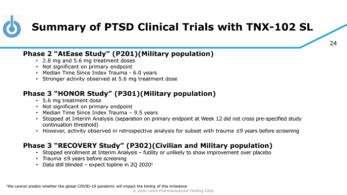 © 2020 Tonix Pharmaceuticals Holding Corp. 24 Summary of PTSD Clinical Trials with TNX - 102 SL Phase 2 “ AtEase Study” (P201)(Military population) • 2.8 mg and 5.6 mg treatment doses • Not significant on primary endpoint • Median Time Since Index Trauma - 6.0 years • Stronger activity observed at 5.6 mg treatment dose Phase 3 “H ONOR Study” (P301)(Military population) • 5.6 mg treatment dose • Not significant on primary endpoint • Median Time Since Index Trauma – 9.5 years • Stopped at Interim Analysis (separation on primary endpoint at Week 12 did not cross pre - specified study continuation threshold) • However, activity observed in retrospective analysis for subset with trauma ≤9 years before screening Phase 3 “R ECOVERY Study” (P302)(Civilian and Military population) • Stopped enrollment at Interim Analysis – futility or unlikely to show improvement over placebo • Trauma ≤9 years before screening • Data still blinded – expect topline in 2Q 2020 1 1 We cannot predict whether the global COVID - 19 pandemic will impact the timing of this milestone