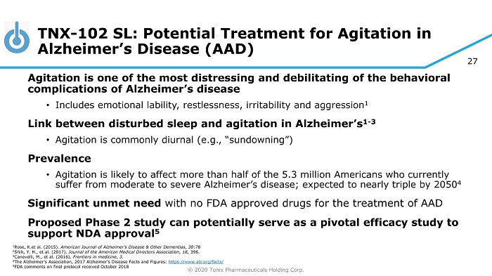 © 2020 Tonix Pharmaceuticals Holding Corp. 26 Opportunities to Expand to Other Indications Growing recognition that there are many disorders where sleep disturbances may have a role in the pathophysiology (cardiovascular, metabolic, neurologic) • Sleep quality plays a homeostatic role in several disorders Psychiatric Disorders • Stress Disorders (PTSD) • Mood Disorders (Depression) • Anxiety Disorders • Addiction (Alcohol Use Disorder) Chronic Pain States • Chronic wide - spread pain (fibromyalgia) • Osteoarthritis Role of sleep disturbance more established in common psychiatric and neurological/pain disorders • Recognized as a core symptom of many of these disorders • Traditional sleep medications, which increase sleep quantity, may not provide benefit (benzodiazepines in major depression) or are contraindicated Psychiatric Symptoms of Neurological Disorders • Agitation in Alzheimer’s • Psychosis in Parkinson’s, Alzheimer’s and other dementias
