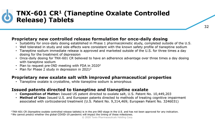 © 2020 Tonix Pharmaceuticals Holding Corp. 32 TNX - 601 CR 1 (Tianeptine Oxalate Controlled Release) Tablets Proprietary new controlled release formulation for once - daily dosing • Suitability for once - daily dosing established in Phase 1 pharmacokinetic study, completed outside of the U.S. • Well tolerated in study and side effects were consistent with the known safety profile of tianeptine sodium • Tianeptine sodium immediate release is approved and marketed outside of the U.S. for three times a day dosing for the treatment of depression • Once - daily dosing for TNX - 601 CR believed to have an adherence advantage over three times a day dosing with tianeptine sodium • Plan to request pre - IND meeting with FDA in 2020 2 • Plan for Phase 2 study in depression in 2021 2 Proprietary new oxalate salt with improved pharmaceutical properties • Tianeptine oxalate is crystalline, while tianeptine sodium is amorphous Issued patents directed to tianeptine and tianeptine oxalate • Composition of Matter: Issued US patent directed to oxalate salt, U.S. Patent No. 10,449,203 • Method of Use: Issued U.S. and European patents directed to methods of treating cognitive impairment associated with corticosteroid treatment (U.S. Patent No. 9,314,469; European Patent No. 3246031) 1 TNX - 601 CR (tianeptine oxalate controlled release tablets) is in the pre - IND stage in the U.S. and has not been approved for any indication. 2 We cannot predict whether the global COVID - 19 pandemic will impact the timing of these milestones.