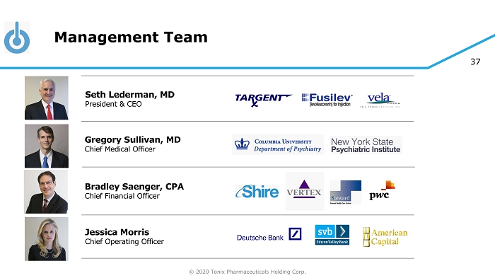 © 2020 Tonix Pharmaceuticals Holding Corp. 36 Milestones – Recently Completed and Upcoming 1 □ 4 th Quarter 2019 Confirmed once - daily dosing for TNX - 601 CR in PK study □ 4 th Quarter 2019 Enrolled first patient in TNX - 102 SL Phase 3 F304/RELIEF study for management of fibromyalgia □ February 2020 Interim analysis results reported from TNX - 102 SL Phase 3 P302/RECOVERY study in PTSD □ 2 rd Quarter 2020 Expect to submit IND application for TNX - 102 SL to support Phase 2 POC study in AUD □ 3 rd Quarter 2020 Expect small animal data from TNX - 1800 in COVID - 19 model □ 3 rd Quarter 2020 Expect primate data from TNX - 1800 in COVID - 19 model □ 3 rd Quarter 2020 Interim analysis results from TNX - 102 SL Phase 3 F304/RELIEF study in fibromyalgia expected □ 1 st Half 2021 Expect to initiate Phase 2 study of TNX - 601 CR in depression, ex - U.S. □ 1 st Half 2021 Topline data from TNX - 102 SL Phase 3 F304/RELIEF study in fibromyalgia expected x x x 1 We cannot predict whether the global COVID - 19 pandemic will impact the timing of these milestones.