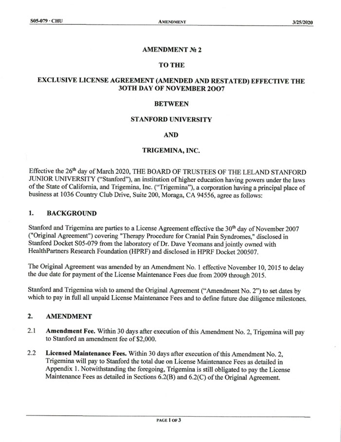 SOS-079 ·CHU AMENDMENT 3/25/2020 AMENDMENT .NI!2 TO THE EXCLUSIVE LICENSE AGREEMENT (AMENDED AND RESTATED) EFFECTIVE THE 30TH DAY OF NOVEMBER 2007 BETWEEN STANFORD UNIVERSITY AND TRIGEMINA, INC. Effective the 26th day ofMarch2020, THE BOARD OF TRUSTEES OF THE LELAND STANFORD JUNIOR UNIVERSITY (“Stanford”), an institution of higher education having powers under the laws of the State of California, and Trigemina, Inc. (“Trigemina”), a corporation having a principal place of business at 1036 Country Club Drive, Suite 200, Moraga, CA 94556, agree as follows: 1. BACKGROUND Stanford and Trigemina are parties to a License Agreement effective the 30th day of November 2007 (“Original Agreement”) covering “Therapy Procedure for Cranial Pain Syndromes,” disclosed in Stanford Docket S05-079 from the laboratory of Dr. Dave Yeomans and jointly owned with HealthPartners Research Foundation (HPRF) and disclosed in HPRF Docket 200507. The Original Agreement was amended by an Amendment No.1 effective November 10,2015 to delay the due date for payment of the License Maintenance Fees due from 2009 through 2015. Stanford and Trigemina wish to amend the Original Agreement (“Amendment No.2”) to set dates by which to pay in full all unpaid License Maintenance Fees and to defme future due diligence milestones. 2. AMENDMENT 2.1 Amendment Fee. Within 30 days after execution of this Amendment No. 2, Trigemina will pay to Stanford an amendment fee of$2,000. 2.2 Licensed Maintenance Fees. Within 30 days after execution of this Amendment No.2, Trigemina will pay to Stanford the total due on License Maintenance Fees as detailed in Appendix 1. Notwithstanding the foregoing, Trigemina is still obligated to pay the License Maintenance Fees as detailed in Sections 6.2(B) and 6.2(C) of the Original Agreement.