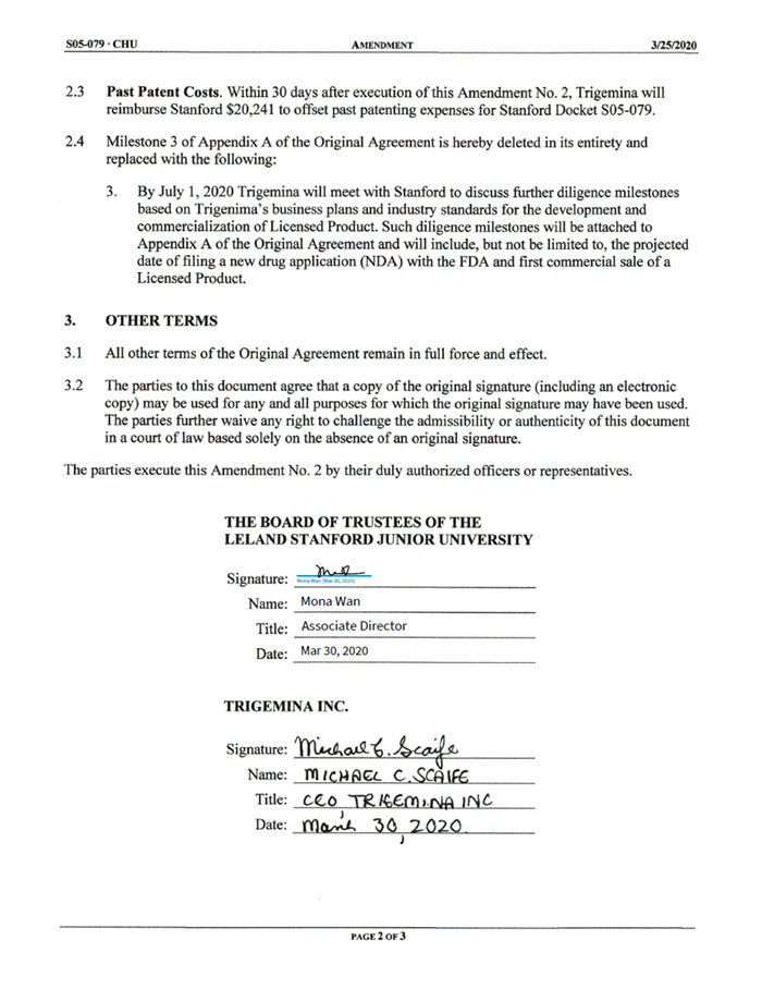 Appendix A of the Original Agreement and will include, but not be limited to, the projected date of filing a new drug application (NDA) with the FDA and first commercial sale of a Licensed Product. 3. OTHER TERMS 3.1 All other terms of the Original Agreement remain in full force and effect. 3.2 The parties to this document agree that a copy of the original signature (including an electronic copy) may be used for any and all purposes for which the original signature may have been used. The parties further waive any right to challenge the admissibility or authenticity of this document in a court of law based solely on the absence of an original signature. The parties execute this Amendment No. 2 by their duly authorized officers or representatives. TM BOARD OF TRUSTEES OF THE LELAND STANFORD JUNIOR UNIVERSITY Signature: Name: Title: Date: Mona Wan Associate Director Mar 30, 2020 Mona Wan (Mar 30, 020) TRIGEMINA INC. PAGE 2 OF 3