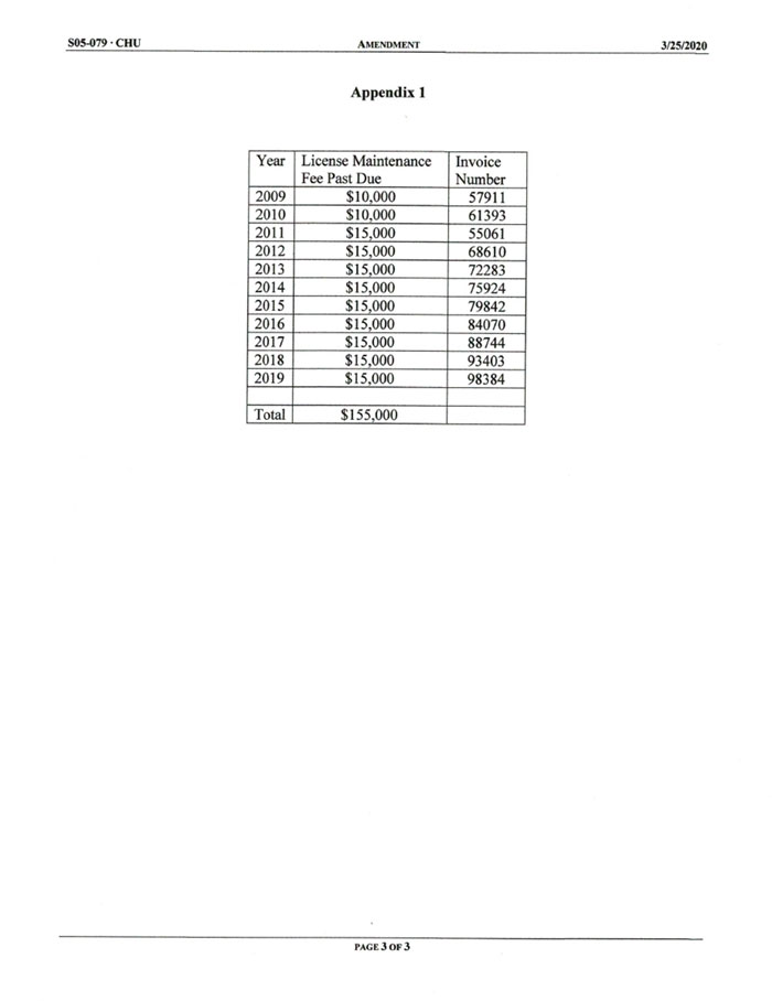 SOS-079 ·CHU AMENDMENT 3/25/2020 Appendix 1 Year License Maintenance Fee Past Due Invoice Number 2009 $10,000 57911 2010 $10,000 61393 2011 $15,000 55061 2012 $15,000 68610 2013 $15,000 72283 2014 $15,000 75924 2015 $15,000 79842 2016 $15,000 84070 2017 $15,000 88744 2018 $15,000 93403 2019 $15,000 98384 Total $155,000