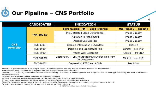 © 2021 Tonix Pharmaceuticals Holding Corp. 3 Tonix Pharmaceuticals Who We Are – Mission And Purpose Clinical - stage biopharmaceutical company that invents and develops medicines to help patients manage the central nervous system (CNS) and immunology diseases. “Advancing science to improve patient care and public health”