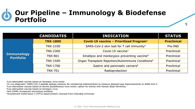 © 2021 Tonix Pharmaceuticals Holding Corp. 4 Our Pipeline – CNS Portfolio CANDIDATES INDICATION STATUS CNS Portfolio TNX - 102 SL 1 Fibromyalgia (FM) - Lead Program Mid - Phase 3 – ongoing PTSD - Related Sleep Disturbance 2 Phase 3 ready Agitation in Alzheimer’s Phase 2 ready Alcohol Use Disorder Phase 2 ready TNX - 1300 3 Cocaine Intoxication / Overdose Phase 2 TNX - 1900 4 Migraine and Craniofacial Pain Clinical – pre - IND 5 TNX - 2900 6 Prader - Willi Syndrome Clinical – pre - IND TNX - 601 CR Depression, PTSD, Neurocognitive Dysfunction from Corticosteroids Clinical – pre - IND 7 TNX - 1600 8 Depression, PTSD and ADHD Preclinical 1 TNX - 102 SL (cyclobenzaprine HCl sublingual tablets) is an investigational new drug and has not been approved for any indication. 2 PTSD - Related Sleep Disturbance is a proposed new indication pending discussion with FDA 3 TNX - 1300 (T172R/G173Q double - mutant cocaine esterase 200 mg, i.v. solution) is an investigational new biologic and has not been approved for any indication; licensed from Columbia University . 4 Acquired from Trigemina ; license agreement with Stanford University 5 A Phase 2 trial under an investigator - initiated IND has been completed in the U.S. using TNX - 1900 6 Co - exclustive license agreement with French National Institute of Health and Medical Research ( Inserm ) 7 TN X - 601 CR is in the pre - IND stage in the U.S.; a Phase 1 trial for formulation development was recently completed outside of the U.S. 8 Acquired from TRImaran Pharma; license agreement with Wayne State University
