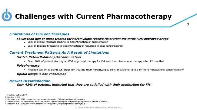 © 2021 Tonix Pharmaceuticals Holding Corp. 6 TNX - 102 SL FM Lead Program Background on Fibromyalgia Fibromyalgia (FM): A chronic condition Core symptoms: • widespread pain • sleep disturbance • fatigue • cognitive symptoms. Significant disabilities (impaired daily function). Course of disease can last decades 1 American Chronic Pain Association (www.theacpa.org, 2019) 2 . Walitt, B., Nahin, R.L., Katz, R.S., Bergman, M.J., Wolfe, F. (2015). The Prevalence and Characteristics of Fibromyalgia in the 2012 National Health Interview Survey. PLoS One; 10(9): e0138024. 3. Decision Resources, Fibromyalgia, 2012 Prevalence 2 - 4% US Population (6 - 12 million individuals) 1 90% Treated With Pharmacotherapy 3 Estimated 4.5MM Diagnosed 2