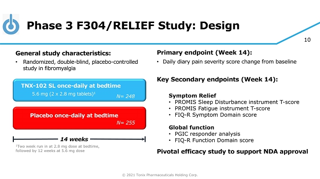 © 2021 Tonix Pharmaceuticals Holding Corp. 9 TNX - 102 SL: Engineered to Treat FM This unique formulation of cyclobenzaprine has been designed to optimize delivery and absorption, while minimizing the potential residual effects of oral formulations of cyclobenzaprine. Innovative and proprietary Protectic ® delivery technology • Overcomes mucosal absorption barrier • Allows sublingual (SL) administration to achieves relevant systemic drug exposure • Stable SL tablet formulation • Benefits of sublingual delivery • Rapid drug exposure following nighttime administration • Lower daytime exposure • Avoids first - pass metabolism • Reduces risk of pharmacological interference from major metabolite No recognized abuse or dependency concerns