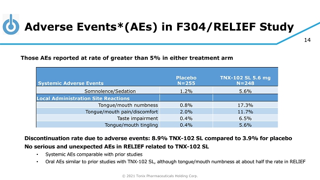 © 2021 Tonix Pharmaceuticals Holding Corp. 13 F304/RELIEF Study: Key Secondary Efficacy Endpoints ◊ ◊ *TNX - 102 SL is in clinical stage of development and not approved for any indication Outcome Measure at Week 14 Intent - to - Treat Analysis 1 P - value Non - Specific Patient Global Impression of Change Responder Analysis: Proportion “Much Improved” or “Very Much Improved” 0.058 Fibromyalgia Syndrome - Related FIQ - R Symptom Domain Mean Change from Baseline 0.007 # FIQ - R Function Domain Mean Change from Baseline 0.009 # PROMIS Fatigue Mean Change from Baseline 0.018 # Daily Sleep Quality Diary, NRS Mean Change from Baseline <0.001 # PROMIS Sleep Disturbance Mean Change from Baseline <0.001 # # nominally significant at p<0.0452 1 Combined periods (pre - and post - interim analysis); responder analysis is by Logistic Regression (missing = non - responder); the f ive mean change analyses are by Mixed Model Repeated Measures with Multiple Imputation Abbreviations: FIQ - R = Fibromyalgia Impact Questionnaire – Revised; NRS = numeric rating scale; PROMIS = Patient - Reported Outcomes Measurement Information System