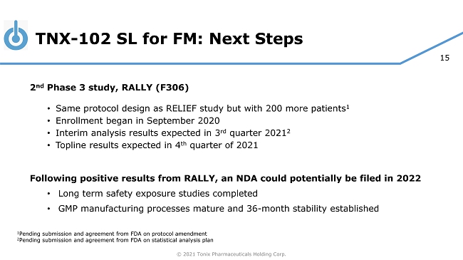 © 2021 Tonix Pharmaceuticals Holding Corp. 14 Adverse Events*(AEs) in F304/RELIEF Study Discontinuation rate due to adverse events: 8.9% TNX - 102 SL compared to 3.9% for placebo No serious and unexpected AEs in RELIEF related to TNX - 102 SL • Systemic AEs comparable with prior studies • Oral AEs similar to prior studies with TNX - 102 SL, although tongue/mouth numbness at about half the rate in RELIEF Those AEs reported at rate of greater than 5% in either treatment arm Systemic Adverse Events Placebo N=255 TNX - 102 SL 5.6 mg N=248 Somnolence/Sedation 1.2% 5.6% Local Administration Site Reactions Tongue/mouth numbness 0.8% 17.3% Tongue/mouth pain/discomfort 2.0% 11.7% Taste impairment 0.4% 6.5% Tongue/mouth tingling 0.4% 5.6%