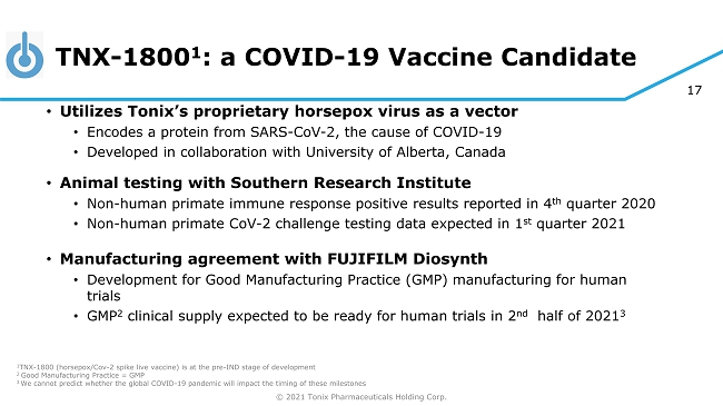 © 2021 Tonix Pharmaceuticals Holding Corp. 16 COVID - 19 Vaccines: Still Uncertainty Durability of protection • Are vaccinated people protected one year later? • Durable protection is associated with T cell response Protection against forward transmission • Highly contagious nature of CoV - 2 is a major problem driving pandemic No biomarker of protection • No test to establish protection from vaccination Current and future variants • Unknown effectiveness of existing vaccines Potential for need to have annual vaccinations • High capacity and low costs become critical