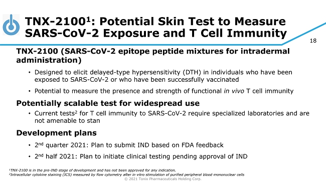 © 2021 Tonix Pharmaceuticals Holding Corp. 17 TNX - 1800 1 : a COVID - 19 Vaccine Candidate • Utilizes Tonix’s proprietary horsepox virus as a vector • Encodes a protein from SARS - CoV - 2, the cause of COVID - 19 • Developed in collaboration with University of Alberta, Canada • Animal testing with Southern Research Institute • Non - human primate immune response positive results reported in 4 th quarter 2020 • Non - human primate CoV - 2 challenge testing data expected in 1 st quarter 2021 • Manufacturing agreement with FUJIFILM Diosynth • Development for Good Manufacturing Practice (GMP) manufacturing for human trials • GMP 2 clinical supply expected to be ready for human trials in 2 nd half of 2021 3 1 TNX - 1800 (horsepox/Cov - 2 spike live vaccine) is at the pre - IND stage of development 2 Good Manufacturing Practice = GMP 3 We cannot predict whether the global COVID - 19 pandemic will impact the timing of these milestones