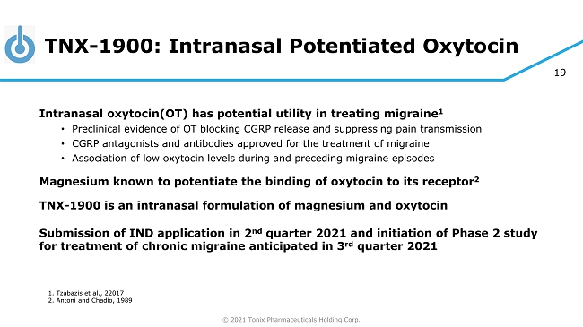 © 2021 Tonix Pharmaceuticals Holding Corp. 18 TNX - 2100 1 : Potential Skin Test to Measure SARS - CoV - 2 Exposure and T Cell Immunity TNX - 2100 (SARS - CoV - 2 epitope peptide mixtures for intradermal administration) • Designed to elicit delayed - type hypersensitivity (DTH) in individuals who have been exposed to SARS - CoV - 2 or who have been successfully vaccinated • Potential to measure the presence and strength of functional in vivo T cell immunity Potentially scalable test for widespread use • Current tests 2 for T cell immunity to SARS - CoV - 2 require specialized laboratories and are not amenable to stan Development plans • 2 nd quarter 2021: Plan to submit IND based on FDA feedback • 2 nd half 2021: Plan to initiate clinical testing pending approval of IND 1 TNX - 2100 is in the pre - IND stage of development and has not been approved for any indication. 2 Intracellular cytokine staining (ICS) measured by flow cytometry after in vitro stimulation of purified peripheral blood mono nuc lear cells