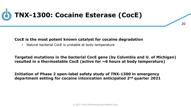 © 2021 Tonix Pharmaceuticals Holding Corp. 20 TNX - 1300: Cocaine Esterase (CocE) CocE is the most potent known catalyst for cocaine degradation • Natural bacterial CocE is unstable at body temperature Targeted mutations in the bacterial CocE gene (by Columbia and U. of Michigan) resulted in a thermostable CocE (active for ~6 hours at body temperature) Initiation of Phase 2 open - label safety study of TNX - 1300 in emergency department setting for cocaine intoxication anticipated 2 nd quarter 2021