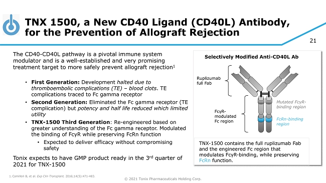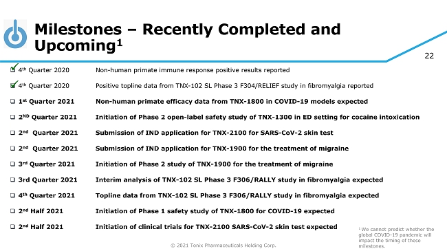 © 2021 Tonix Pharmaceuticals Holding Corp. 21 TNX 1500, a New CD40 Ligand (CD40L) Antibody, for the Prevention of Allograft Rejection The CD40 - CD40L pathway is a pivotal immune system modulator and is a well - established and very promising treatment target to more safely prevent allograft rejection 1 • First Generation: Development halted due to thromboembolic complications (TE) – blood clots . TE complications traced to Fc gamma receptor • Second Generation: Eliminated the Fc gamma receptor (TE complication) but potency and half life reduced which limited utility • TNX - 1500 Third Generation : Re - engineered based on greater understanding of the Fc gamma receptor. Modulated the binding of FcyR while preserving FcRn function • Expected to deliver efficacy without compromising safety Tonix expects to have GMP product ready in the 3 rd quarter of 2021 for TNX - 1500 1. Camilleri B, et al. Exp Clin Transplant. 2016;14(5):471 - 483. Ruplizumab full Fab Selectively Modified Anti - CD40L Ab TNX - 1500 contains the full ruplizumab Fab and the engineered Fc region that modulates Fc γ R - binding, while preserving FcRn function. Mutated Fc γ R - binding region FcRn - binding region Fc γ R - modulated Fc region