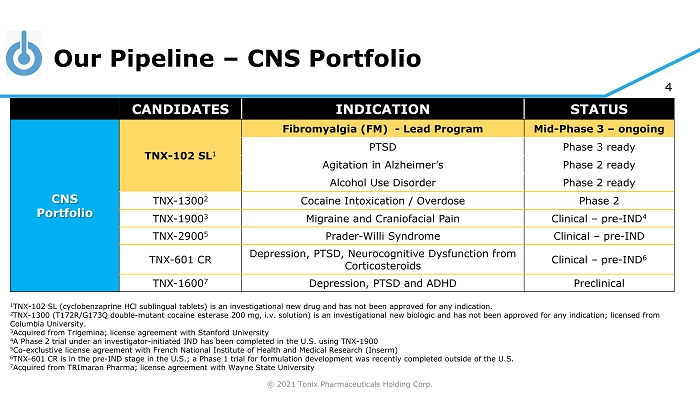 © 2021 Tonix Pharmaceuticals Holding Corp. 3 Tonix Pharmaceuticals Who We Are – Mission And Purpose Clinical - stage biopharmaceutical company that invents and develops medicines to help patients manage the central nervous system (CNS) and immunology diseases. “Advancing science to improve patient care and public health”