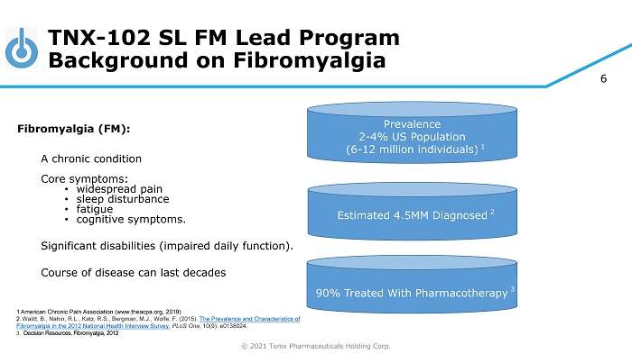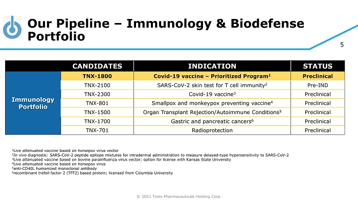 © 2021 Tonix Pharmaceuticals Holding Corp. 4 Our Pipeline – CNS Portfolio CANDIDATES INDICATION STATUS CNS Portfolio TNX - 102 SL 1 Fibromyalgia (FM) - Lead Program Mid - Phase 3 – ongoing PTSD Phase 3 ready Agitation in Alzheimer’s Phase 2 ready Alcohol Use Disorder Phase 2 ready TNX - 1300 2 Cocaine Intoxication / Overdose Phase 2 TNX - 1900 3 Migraine and Craniofacial Pain Clinical – pre - IND 4 TNX - 2900 5 Prader - Willi Syndrome Clinical – pre - IND TNX - 601 CR Depression, PTSD, Neurocognitive Dysfunction from Corticosteroids Clinical – pre - IND 6 TNX - 1600 7 Depression, PTSD and ADHD Preclinical 1 TNX - 102 SL (cyclobenzaprine HCl sublingual tablets) is an investigational new drug and has not been approved for any indication. 2 TNX - 1300 (T172R/G173Q double - mutant cocaine esterase 200 mg, i.v. solution) is an investigational new biologic and has not been approved for any indication; licensed from Columbia University . 3 Acquired from Trigemina ; license agreement with Stanford University 4 A Phase 2 trial under an investigator - initiated IND has been completed in the U.S. using TNX - 1900 5 Co - exclustive license agreement with French National Institute of Health and Medical Research ( Inserm ) 6 TN X - 601 CR is in the pre - IND stage in the U.S.; a Phase 1 trial for formulation development was recently completed outside of the U.S. 7 Acquired from TRImaran Pharma; license agreement with Wayne State University