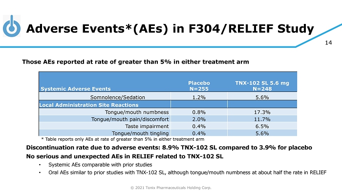 © 2021 Tonix Pharmaceuticals Holding Corp. 13 F304/RELIEF Study: Key Secondary Efficacy Endpoints ◊ ◊ *TNX - 102 SL is in clinical stage of development and not approved for any indication Outcome Measure at Week 14 Intent - to - Treat Analysis 1 P - value Non - Specific Patient Global Impression of Change Responder Analysis: Proportion “Much Improved” or “Very Much Improved” 0.058 Fibromyalgia Syndrome - Related FIQ - R Symptom Domain Mean Change from Baseline 0.007 # FIQ - R Function Domain Mean Change from Baseline 0.009 # PROMIS Fatigue Mean Change from Baseline 0.018 # Daily Sleep Quality Diary, NRS Mean Change from Baseline <0.001 # PROMIS Sleep Disturbance Mean Change from Baseline <0.001 # # nominally significant at p<0.0452 1 Combined periods (pre - and post - interim analysis); responder analysis is by Logistic Regression (missing = non - responder); the f ive mean change analyses are by Mixed Model Repeated Measures with Multiple Imputation Abbreviations: FIQ - R = Fibromyalgia Impact Questionnaire – Revised; NRS = numeric rating scale; PROMIS = Patient - Reported Outcomes Measurement Information System