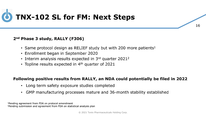 © 2021 Tonix Pharmaceuticals Holding Corp. 15 Approved Fibromyalgia Pharmacotherapies Pfizer • Drug: Lyrica® or pregabalin (U.S. patent expired in 2018) • Approved: 2004 • Mechanism: modulates nerve impulses involved in the transmission of pain through selective binding to the alpha2 - delta protein of the voltage - gated calcium channels in CNS tissues • Peak Sales: Approximately $5 billion (including all approved indications) Lilly • Drug: Cymbalta® or duloxetine (U.S. patent expired 2014) • Approved: 2004 • Mechanism: serotonin and norepinephrine reuptake inhibitor (SNRI) • Peak Sales: Approximately $5 billion (including all approved indications) Abbvie (developed by Forest Laboratories) • Drug: Savella ® or milnacipran (on patent) • Approved: 2009 • Mechanism: serotonin and norepinephrine reuptake inhibitor (SNRI) • Peak Sales: Approximately $130 million (approved for fibromyalgia indication only)