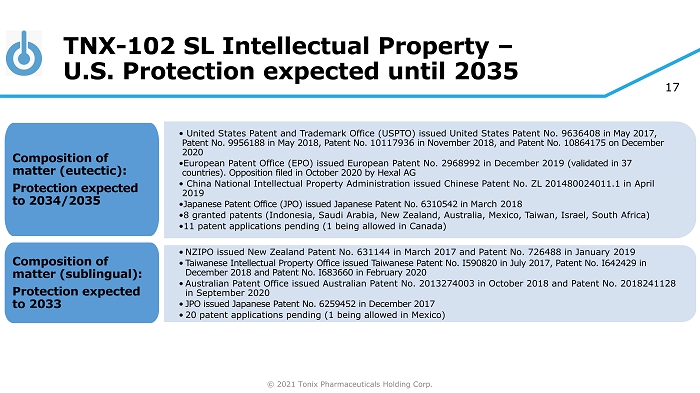 © 2021 Tonix Pharmaceuticals Holding Corp. 17 TNX - 102 SL Intellectual Property – U.S. Protection expected until 2035 • United States Patent and Trademark Office (USPTO) issued United States Patent No. 9636408 in May 2017, Patent No. 9956188 in May 2018, Patent No. 10117936 in November 2018, and Patent No. 10864175 on December 2020 • European Patent Office (EPO) issued European Patent No. 2968992 in December 2019 (validated in 37 countries). Opposition filed in October 2020 by Hexal AG • China National Intellectual Property Administration issued Chinese Patent No. ZL 201480024011.1 in April 2019 • Japanese Patent Office (JPO) issued Japanese Patent No. 6310542 in March 2018 • 8 granted patents (Indonesia, Saudi Arabia, New Zealand, Australia, Mexico, Taiwan, Israel, South Africa) • 11 patent applications pending (1 being allowed in Canada) Composition of matter (eutectic): Protection expected to 2034/2035 • NZIPO issued New Zealand Patent No. 631144 in March 2017 and Patent No. 726488 in January 2019 • Taiwanese Intellectual Property Office issued Taiwanese Patent No. I590820 in July 2017, Patent No. I642429 in December 2018 and Patent No. I683660 in February 2020 • Australian Patent Office issued Australian Patent No. 2013274003 in October 2018 and Patent No. 2018241128 in September 2020 • JPO issued Japanese Patent No. 6259452 in December 2017 • 20 patent applications pending (1 being allowed in Mexico) Composition of matter (sublingual): Protection expected to 2033
