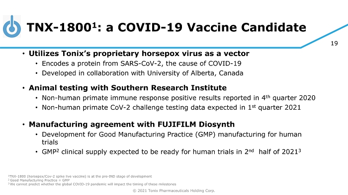 © 2021 Tonix Pharmaceuticals Holding Corp. 18 COVID - 19 Vaccines: Still Uncertainty Durability of protection • Are vaccinated people protected one year later? • Durable protection is associated with T cell response Protection against forward transmission • Highly contagious nature of CoV - 2 is a major problem driving pandemic No biomarker of protection • No test to establish protection from vaccination Current and future variants • Unknown effectiveness of existing vaccines Potential for need to have annual vaccinations • High capacity and low costs become critical