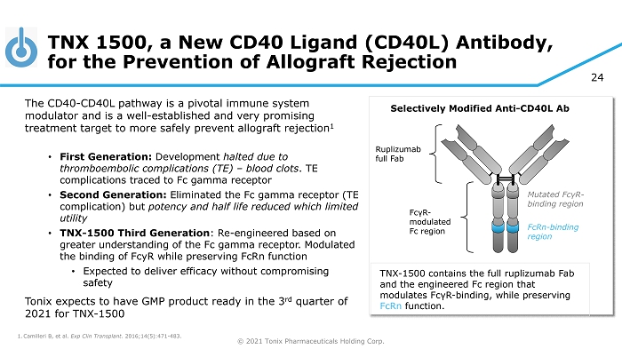 © 2021 Tonix Pharmaceuticals Holding Corp. 24 TNX 1500, a New CD40 Ligand (CD40L) Antibody, for the Prevention of Allograft Rejection The CD40 - CD40L pathway is a pivotal immune system modulator and is a well - established and very promising treatment target to more safely prevent allograft rejection 1 • First Generation: Development halted due to thromboembolic complications (TE) – blood clots . TE complications traced to Fc gamma receptor • Second Generation: Eliminated the Fc gamma receptor (TE complication) but potency and half life reduced which limited utility • TNX - 1500 Third Generation : Re - engineered based on greater understanding of the Fc gamma receptor. Modulated the binding of FcyR while preserving FcRn function • Expected to deliver efficacy without compromising safety Tonix expects to have GMP product ready in the 3 rd quarter of 2021 for TNX - 1500 1. Camilleri B, et al. Exp Clin Transplant. 2016;14(5):471 - 483. Ruplizumab full Fab Selectively Modified Anti - CD40L Ab TNX - 1500 contains the full ruplizumab Fab and the engineered Fc region that modulates Fc γ R - binding, while preserving FcRn function. Mutated Fc γ R - binding region FcRn - binding region Fc γ R - modulated Fc region