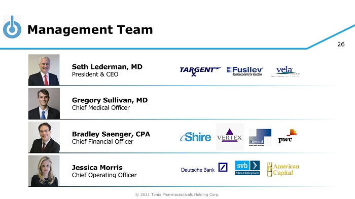 © 2021 Tonix Pharmaceuticals Holding Corp. 25 Milestones – Recently Completed and Upcoming 1 □ 4 th Quarter 2020 Non - human primate immune response positive results reported □ 4 th Quarter 2020 Positive topline data from TNX - 102 SL Phase 3 F304/RELIEF study in fibromyalgia reported □ 1 st Quarter 2021 Non - human primate efficacy data from TNX - 1800 in COVID - 19 models expected □ 2 ND Quarter 2021 Initiation of Phase 2 open - label safety study of TNX - 1300 in ED setting for cocaine intoxication □ 2 nd Quarter 2021 Submission of IND application for TNX - 2100 for SARS - CoV - 2 skin test □ 2 nd Quarter 2021 Submission of IND application for TNX - 1900 for the treatment of migraine □ 3 rd Quarter 2021 Initiation of Phase 2 study of TNX - 1900 for the treatment of migraine □ 3rd Quarter 2021 Interim analysis of TNX - 102 SL Phase 3 F306/RALLY study in fibromyalgia expected □ 4 th Quarter 2021 Topline data from TNX - 102 SL Phase 3 F306/RALLY study in fibromyalgia expected □ 2 nd Half 2021 Initiation of Phase 1 safety study of TNX - 1800 for COVID - 19 expected □ 2 nd Half 2021 Initiation of clinical trials for TNX - 2100 SARS - CoV - 2 skin test expected x 1 We cannot predict whether the global COVID - 19 pandemic will impact the timing of these milestones. x