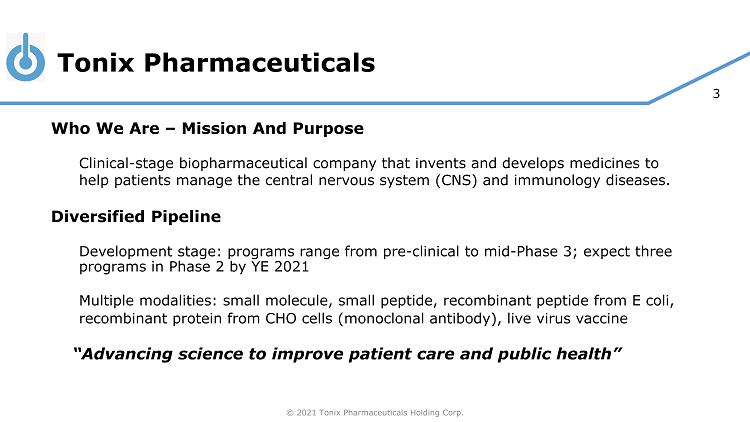 © 2021 Tonix Pharmaceuticals Holding Corp. 2 Cautionary Note on Forward - Looking Statements Certain statements in this presentation regarding strategic plans, expectations and objectives for future operations or results are “forward - looking statements” as defined by the Private Securities Litigation Reform Act of 1995 . These statements may be identified by the use of forward - looking words such as “anticipate,” “believe,” “forecast,” “estimate” and “intend,” among others . These forward - looking statements are based on Tonix’s current expectations and actual results could differ materially . There are a number of factors that could cause actual events to differ materially from those indicated by such forward - looking statements . These factors include, but are not limited to, risks related to failure to obtain U . S . Food and Drug Administration clearances or approvals and noncompliance with its regulations ; our need for additional financing ; delays and uncertainties caused by the global COVID - 19 pandemic ; substantial competition ; uncertainties of patent protection and litigation ; uncertainties of government or third party payor reimbursement ; limited research and development efforts and dependence upon third parties . As with any pharmaceutical under development, there are significant risks in the development, regulatory approval and commercialization of new products . The forward - looking statements in this presentation are made as of the date of this presentation, even if subsequently made available by Tonix on its website or otherwise . Tonix does not undertake an obligation to update or revise any forward - looking statement, except as required by law . Investors should read the risk factors set forth in the Annual Report on Form 10 - K for the year ended December 31 , 2020 , as filed with the Securities and Exchange Commission (the “SEC”) on March 15 , 2021 , and periodic reports and current reports filed with the SEC on or after the date thereof . All of Tonix's forward - looking statements are expressly qualified by all such risk factors and other cautionary statements .