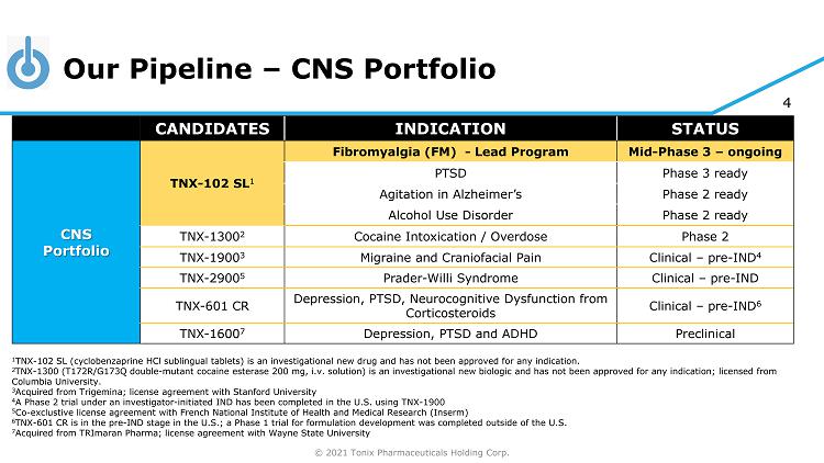 © 2021 Tonix Pharmaceuticals Holding Corp. 3 Tonix Pharmaceuticals Who We Are – Mission And Purpose Clinical - stage biopharmaceutical company that invents and develops medicines to help patients manage the central nervous system (CNS) and immunology diseases. Diversified Pipeline Development stage: programs range from pre - clinical to mid - Phase 3; expect three programs in Phase 2 by YE 2021 Multiple modalities: small molecule, small peptide, recombinant peptide from E coli, recombinant protein from CHO cells (monoclonal antibody), live virus vaccine “Advancing science to improve patient care and public health”