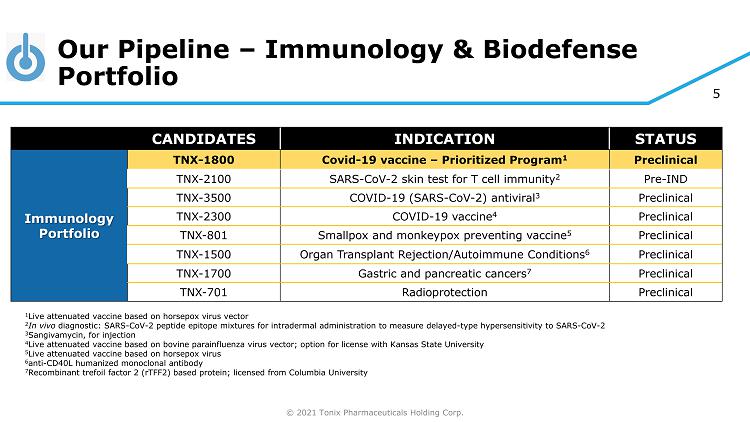 © 2021 Tonix Pharmaceuticals Holding Corp. 4 Our Pipeline – CNS Portfolio CANDIDATES INDICATION STATUS CNS Portfolio TNX - 102 SL 1 Fibromyalgia (FM) - Lead Program Mid - Phase 3 – ongoing PTSD Phase 3 ready Agitation in Alzheimer’s Phase 2 ready Alcohol Use Disorder Phase 2 ready TNX - 1300 2 Cocaine Intoxication / Overdose Phase 2 TNX - 1900 3 Migraine and Craniofacial Pain Clinical – pre - IND 4 TNX - 2900 5 Prader - Willi Syndrome Clinical – pre - IND TNX - 601 CR Depression, PTSD, Neurocognitive Dysfunction from Corticosteroids Clinical – pre - IND 6 TNX - 1600 7 Depression, PTSD and ADHD Preclinical 1 TNX - 102 SL (cyclobenzaprine HCl sublingual tablets) is an investigational new drug and has not been approved for any indication. 2 TNX - 1300 (T172R/G173Q double - mutant cocaine esterase 200 mg, i.v. solution) is an investigational new biologic and has not been approved for any indication; licensed from Columbia University . 3 Acquired from Trigemina ; license agreement with Stanford University 4 A Phase 2 trial under an investigator - initiated IND has been completed in the U.S. using TNX - 1900 5 Co - exclustive license agreement with French National Institute of Health and Medical Research ( Inserm ) 6 TN X - 601 CR is in the pre - IND stage in the U.S.; a Phase 1 trial for formulation development was completed outside of the U.S. 7 Acquired from TRImaran Pharma; license agreement with Wayne State University
