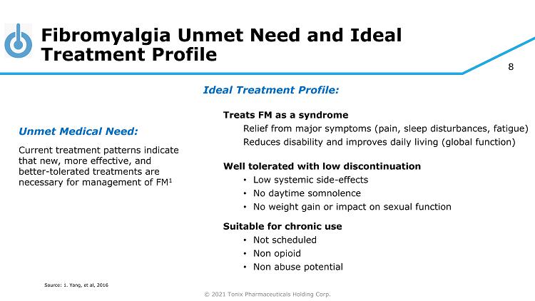 © 2021 Tonix Pharmaceuticals Holding Corp. 7 Challenges with Current Pharmacotherapy Limitations of Current Therapies Fewer than half of those treated for fibromyalgia receive relief from the three FDA - approved drugs 1 • Lack of overall response leading to discontinuation or augmentation • Lack of tolerability leading to discontinuation or reduction in dose (underdosing) Current Treatment Patterns As A Result of Limitations Switch Rates/Rotation/Discontinuation • Over 50% of patient starting an FDA approved therapy for FM switch or discontinue therapy after 12 months 2 Polypharmacy • Average patient is using 2.6 drugs for treating their fibromyalgia, 50% of patients take 3 or more medications concomitantly 3 Opioid usage is not uncommon Market Dissatisfaction Only 43% of patients indicated that they are satisfied with their medication for FM 5 1. Frost and Sullivan, 2010 2. Liu et al., 2016 3. Robinson et al., 2012; prospective observational study with 1,700 participants with fibromyalgia. 4. Sarmento et al., J Opioid Manag 2019; 15(6):460 - 77 – prescription opioid usage among diagnosed FM patients at one site 5. Robinson et al., 2013; prospective observational study with 1,700 participants with fibromyalgia