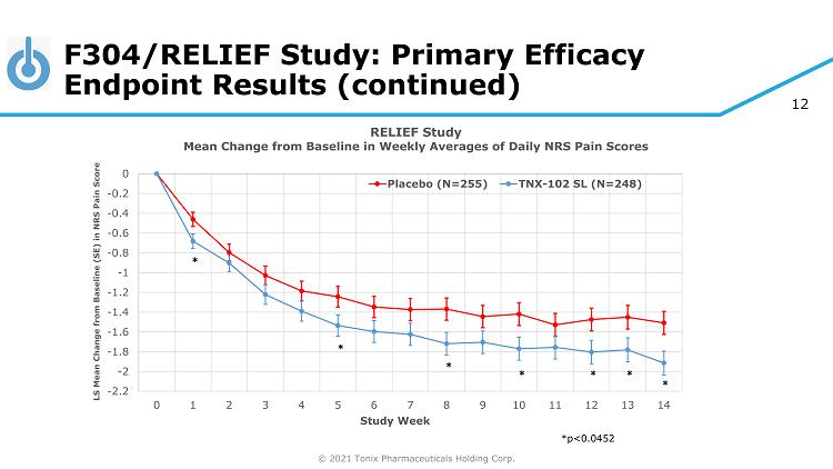 © 2021 Tonix Pharmaceuticals Holding Corp. 11 F304/RELIEF Study Topline Primary Efficacy Endpoint ◊ ◊ Primary Outcome Measure at Week 14 Placebo (N=255) TNX - 102 SL (N=248) Treatment Difference P value LS Mean Change from Baseline 1 (SE) - 1.5 (0.12) - 1.9 (0.12) - 0.4 (0.16) 0.010* Statistical Method: Mixed Model Repeated Measures analysis with Multiple Imputation *p<0.0452 (requisite p - value hurdle for full study after Interim Analysis) 1 Same primary endpoint analysis for FDA approvals of Cymbalta ® and Lyrica ® in fibromyalgia Abbreviations: LS = least squares; NRS = numeric rating scale; SE = standard error Positive outcome for primary endpoint (d aily pain) at Week 14