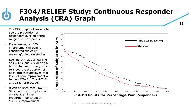 © 2021 Tonix Pharmaceuticals Holding Corp. 12 F304/RELIEF Study: Primary Efficacy Endpoint Results (continued) -2.2 -2 -1.8 -1.6 -1.4 -1.2 -1 -0.8 -0.6 -0.4 -0.2 0 0 1 2 3 4 5 6 7 8 9 10 11 12 13 14 LS Mean Change from Baseline (SE) in NRS Pain Score Study Week RELIEF Study Mean Change from Baseline in Weekly Averages of Daily NRS Pain Scores Placebo (N=255) TNX-102 SL (N=248) * * * * * * * *p<0.0452