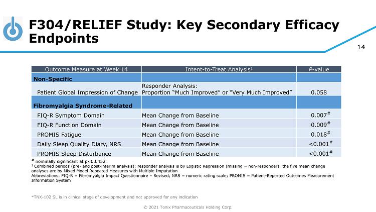 © 2021 Tonix Pharmaceuticals Holding Corp. 13 P e r c e n t o f S u b j e c t s 0 10 20 30 40 50 60 70 80 90 100 Percentage Redution in Pain >=0% >=10% >=20% >=30% >=40% >=50% >=60% >=70% >=80% >=90% =100% Placebo TNX-102 SL Proportion of Subjects in Arm Cut - Off Points for Percentage Pain Responders • The CRA graph allows one to see the proportion of responders over an entire range of cut - off points • For example, >=30% improvement in pain is considered clinically meaningful in pain studies • Looking at that vertical line at >=30% and visualizing a horizontal line to the y - axis tells you the proportion of each arm that achieved that level of pain improvement or better (47% for TNX - 102 SL and 35% for placebo) • It can be seen that TNX - 102 SL separates from placebo, always at a higher proportion, up to about >=95% improvement F304/RELIEF Study: Continuous Responder Analysis (CRA) Graph Placebo TNX - 102 SL 5.6 mg