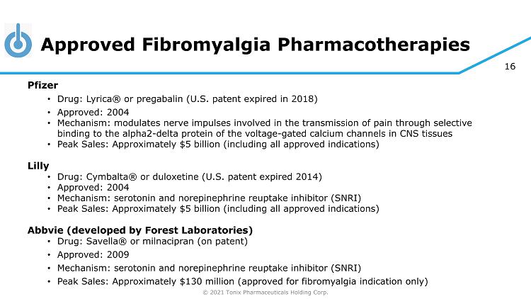 © 2021 Tonix Pharmaceuticals Holding Corp. 15 Adverse Events*(AEs) in F304/RELIEF Study Discontinuation rate due to adverse events: 8.9% TNX - 102 SL compared to 3.9% for placebo No serious and unexpected AEs in RELIEF related to TNX - 102 SL • Systemic AEs comparable with prior studies • Oral AEs similar to prior studies with TNX - 102 SL, although tongue/mouth numbness at about half the rate in RELIEF Those AEs reported at rate of greater than 5% in either treatment arm Systemic Adverse Events Placebo N=255 TNX - 102 SL 5.6 mg N=248 Somnolence/Sedation 1.2% 5.6% Local Administration Site Reactions Tongue/mouth numbness 0.8% 17.3% Tongue/mouth pain/discomfort 2.0% 11.7% Taste impairment 0.4% 6.5% Tongue/mouth tingling 0.4% 5.6% * Table reports only AEs at rate of greater than 5% in either treatment arm
