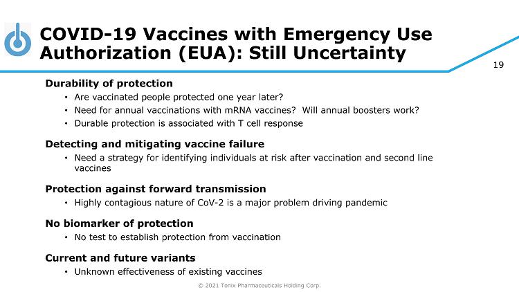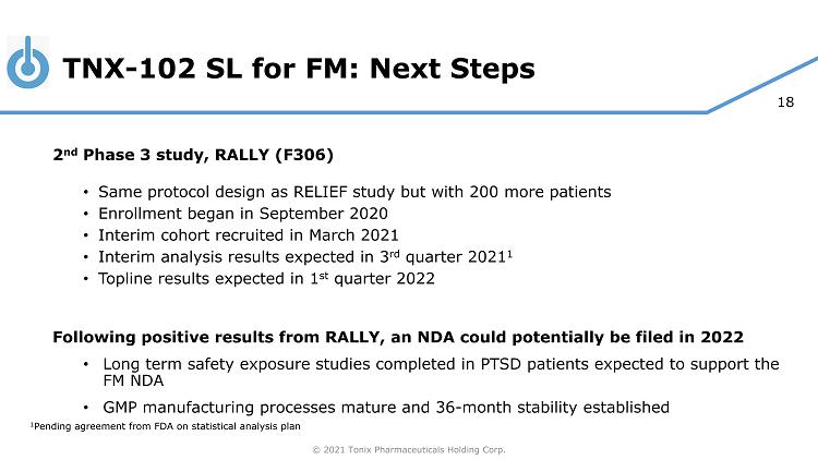 © 2021 Tonix Pharmaceuticals Holding Corp. 18 TNX - 102 SL for FM: Next Steps 2 nd Phase 3 study, RALLY (F306) • Same protocol design as RELIEF study but with 200 more patients • Enrollment began in September 2020 • Interim cohort recruited in March 2021 • Interim analysis results expected in 3 rd quarter 2021 1 • Topline results expected in 1 st quarter 2022 Following positive results from RALLY, an NDA could potentially be filed in 2022 • Long term safety exposure studies completed in PTSD patients expected to support the FM NDA • GMP manufacturing processes mature and 36 - month stability established 1 Pending agreement from FDA on statistical analysis plan