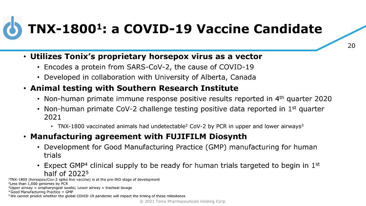 © 2021 Tonix Pharmaceuticals Holding Corp. 20 TNX - 1800 1 : a COVID - 19 Vaccine Candidate • Utilizes Tonix’s proprietary horsepox virus as a vector • Encodes a protein from SARS - CoV - 2, the cause of COVID - 19 • Developed in collaboration with University of Alberta, Canada • Animal testing with Southern Research Institute • Non - human primate immune response positive results reported in 4 th quarter 2020 • Non - human primate CoV - 2 challenge testing positive data reported in 1 st quarter 2021 • TNX - 1800 vaccinated animals had undetectable 2 CoV - 2 by PCR in upper and lower airways 3 • Manufacturing agreement with FUJIFILM Diosynth • Development for Good Manufacturing Practice (GMP) manufacturing for human trials • Expect GMP 4 clinical supply to be ready for human trials targeted to begin in 1 st half of 2022 5 1 TNX - 1800 (horsepox/Cov - 2 spike live vaccine) is at the pre - IND stage of development 2 Less than 1,000 genomes by PCR 3 Upper airway = oropharyngeal swabs; Lower airway = tracheal lavage 4 Good Manufacturing Practice = GMP 5 We cannot predict whether the global COVID - 19 pandemic will impact the timing of these milestones