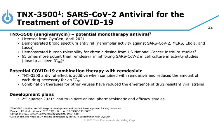 © 2021 Tonix Pharmaceuticals Holding Corp. 21 Potential Profile of TNX - 1800 Compared to EUA Covid - 19 Vaccines 21 Criteria EUA Vaccines TNX - 1800 Number of shots One – two One Duration Unknown Years / decades Boosters Unknown Not required Protection from variants Unknown Likely provides protection Forward Transmission Probably prevents (for PFE) Likely prevents Biomarker None Yes - “Take” Manufacturing Complex Conventional Glass sparing packaging No Yes Shipping and storage Cold Chain Standard refrigeration Protection from smallpox No Yes