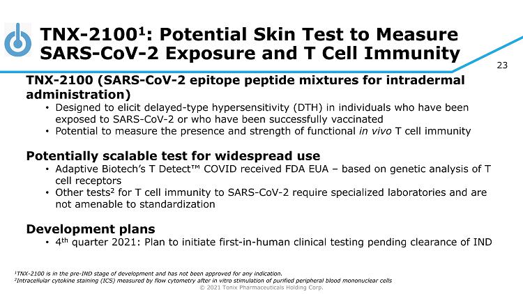 © 2021 Tonix Pharmaceuticals Holding Corp. 22 TNX - 3500 1 : SARS - CoV - 2 Antiviral for the Treatment of COVID - 19 TNX - 3500 (sangivamycin) – potential monotherapy antiviral 2 • Licensed from OyaGen , April 2021 • Demonstrated broad spectrum antiviral (nanomolar activity against SARS - CoV - 2, MERS, Ebola, and Lassa) • Demonstrated human tolerability for chronic dosing from US National Cancer Institute studies 3 • 65 times more potent than remdesivir in inhibiting SARS - CoV - 2 in cell culture infectivity studies (dose to achieve IC 90 ) 4 Potential COVID - 19 combination therapy with remdesivir • TNX - 3500 antiviral effect is additive when combined with remdesivir and reduces the amount of each drug necessary for an IC 90 • Combination therapies for other viruses have reduced the emergence of drug resistant viral strains Development plans • 2 nd quarter 2021: Plan to initiate animal pharmacokinetic and efficacy studies 1 TNX - 3500 is in the pre - IND stage of development and has not been approved for any indication. 2 Bennett, RP et al., Viruses . 2020 13(1):52. doi : 10.3390/v13010052. 3 Cavins JA et al., Cancer Chemotherapy Reports . 1967. 51(4) 4 Data on file, live virus BSL - 4 testing conducted by NIAID in collaboration with OyaGen