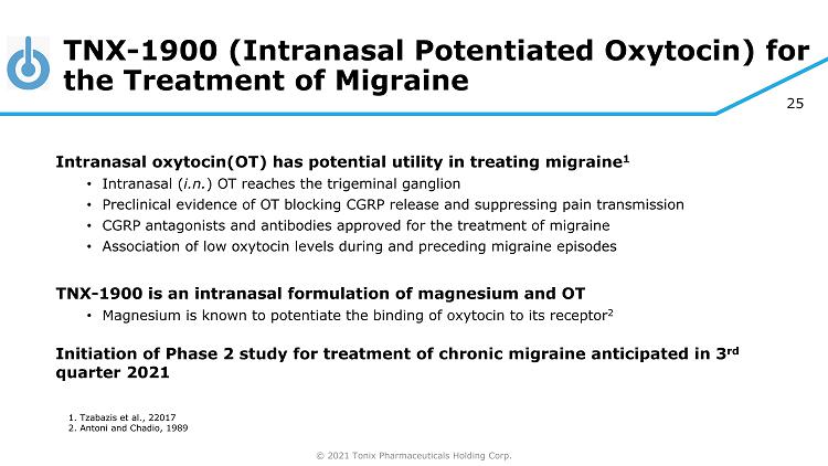 © 2021 Tonix Pharmaceuticals Holding Corp. 25 TNX - 1900 (Intranasal Potentiated Oxytocin) for the Treatment of Migraine Intranasal oxytocin(OT) has potential utility in treating migraine 1 • Intranasal ( i.n. ) OT reaches the trigeminal ganglion • Preclinical evidence of OT blocking CGRP release and suppressing pain transmission • CGRP antagonists and antibodies approved for the treatment of migraine • Association of low oxytocin levels during and preceding migraine episodes TNX - 1900 is an intranasal formulation of magnesium and OT • Magnesium is known to potentiate the binding of oxytocin to its receptor 2 Initiation of Phase 2 study for treatment of chronic migraine anticipated in 3 rd quarter 2021 1. Tzabazis et al., 22017 2. Antoni and Chadio, 1989