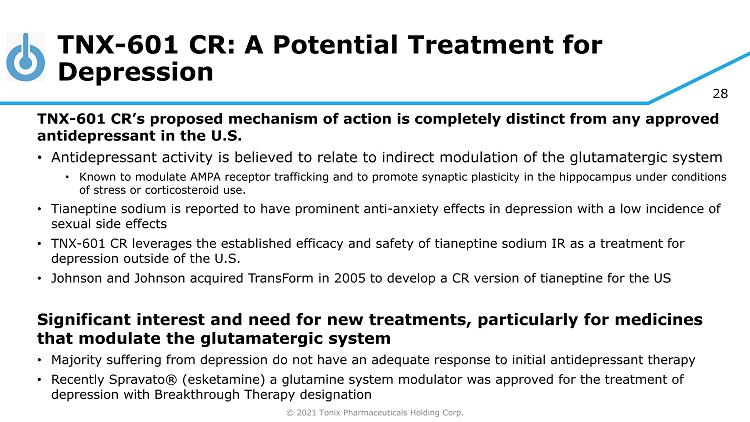 © 2021 Tonix Pharmaceuticals Holding Corp. 27 TNX - 601 CR* (Tianeptine Oxalate and Naloxone HCl Controlled Release) Tablets for the Treatment of Major Depressive Disorder (MDD) Proprietary new controlled release formulation for once - daily dosing • Expect to open IND with a Human Abuse Potential study pending IND clearance • Pending toxicology results, expect to start Phase 2 study in 4Q 2021 • Suitability for once - daily dosing established in Phase 1 pharmacokinetic study, completed outside of the U.S. • Well tolerated in study and side effects were consistent with the known safety profile of tianeptine sodium • Tianeptine sodium immediate release is approved and marketed outside of the U.S. for three times a day dosing for the treatment of depression • Once - daily dosing for TNX - 601 CR believed to have an adherence advantage over three times a day dosing with tianeptine sodium Proprietary new oxalate salt with improved pharmaceutical properties • Tianeptine oxalate is crystalline, while tianeptine sodium is amorphous Issued patents directed to tianeptine and tianeptine oxalate • Composition of Matter: Issued US patent directed to oxalate salt, U.S. Patent No. 10,449,203 and 10,946,027 • Method of Use: Issued European patent directed to methods of treating cognitive impairment associated with corticosteroid treatment, European Patent No. 3246031 *TNX - 601 CR (tianeptine oxalate and naloxone HCl controlled release tablets) is in the pre - IND stage in the U.S. and has not bee n approved for any indication.